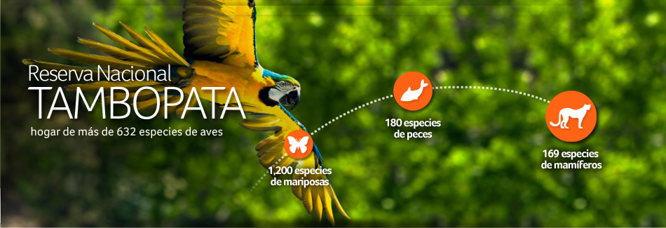 La Reserva Nacional Tambopata alberga hábitats principalmente acuáticos que son usados como paraderos de más de 40 especies de aves migratorias transcontinentales. En la reserva nacional se protege importantes especies consideradas en vías de extinción y le ofrece al turismo un destino privilegiado para la observación de la diversidad de flora y fauna silvestre.